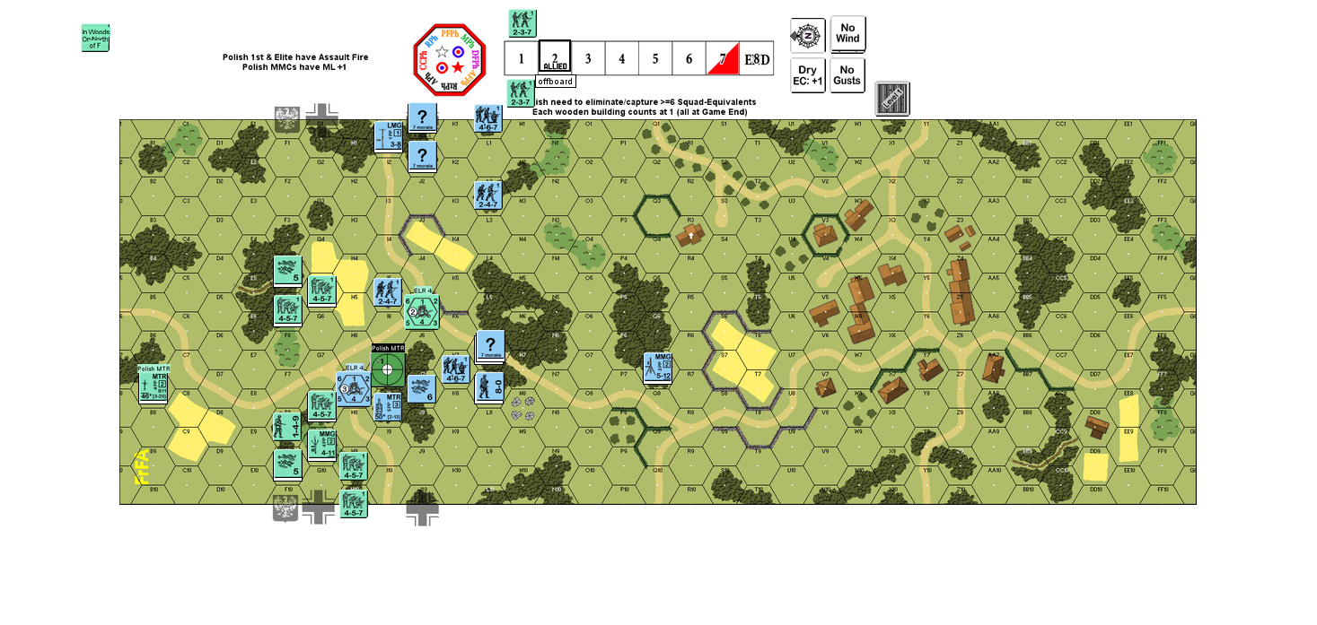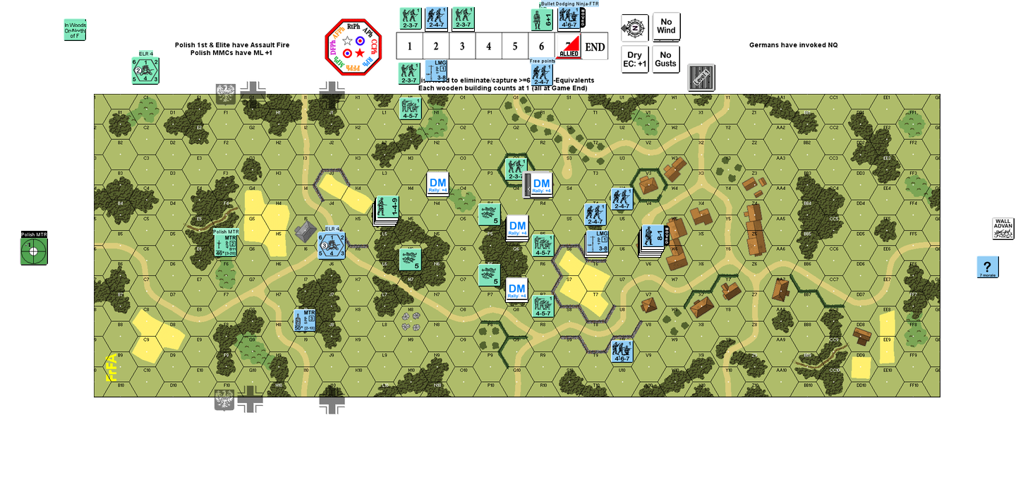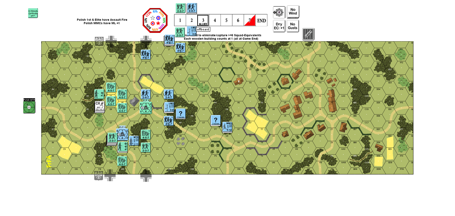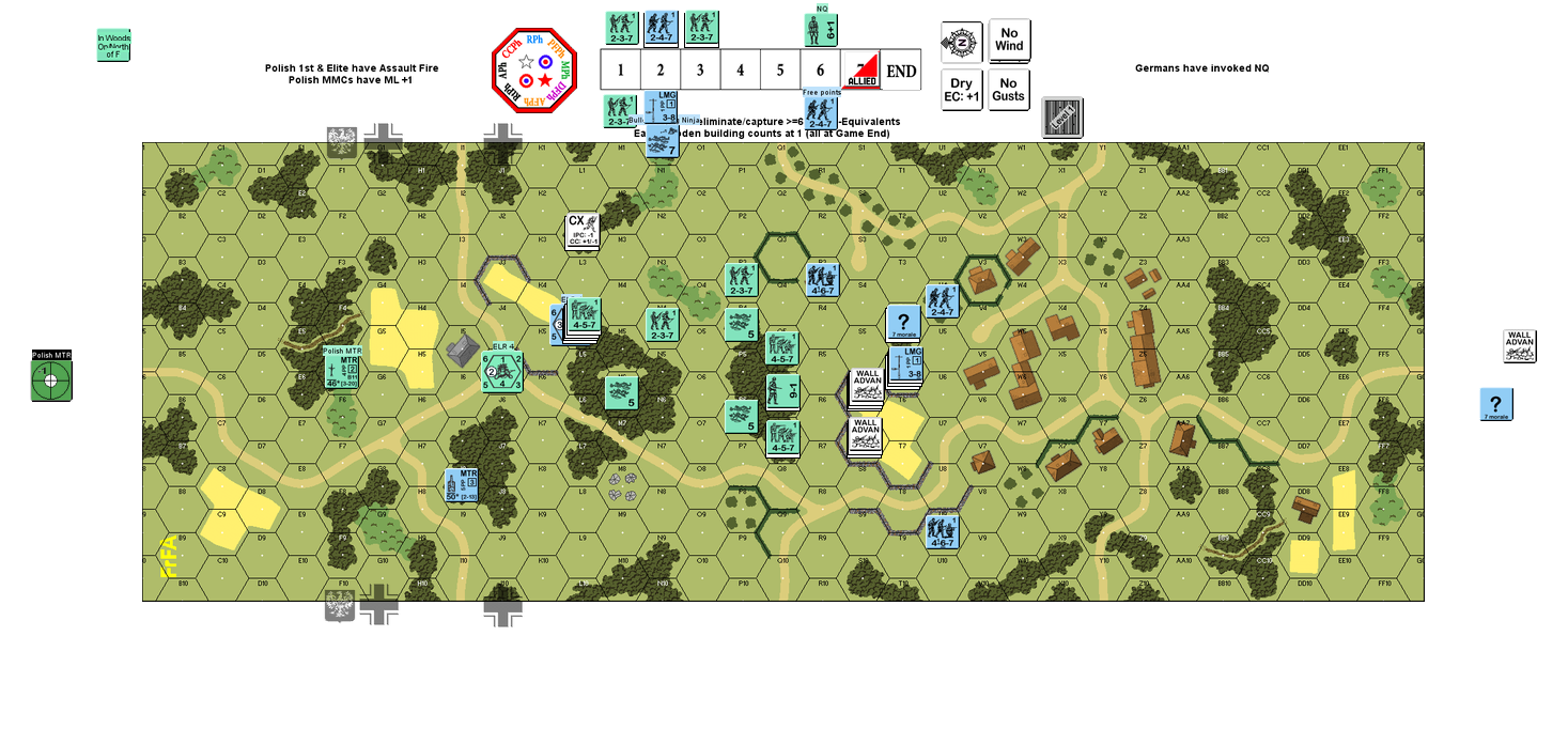 I have forced him out of the stone building in the middle and taken the first row of woods. The problem is that when you're advancing, you have no cover between the woods rows and the German can make you pay. The trick for the German seems to be avoid adjacent units and especially CC at any cost (up to and including Voluntary Break) and NOT to let the Polish behind them. The Polish, on the other hand seem to not be able to go down either side and rush the back field (both to capture buildings and/or kill for FTR) without taking brutal -2 fire which leaves the middle and cover for the Germans' retreat. Seems a real pickle.