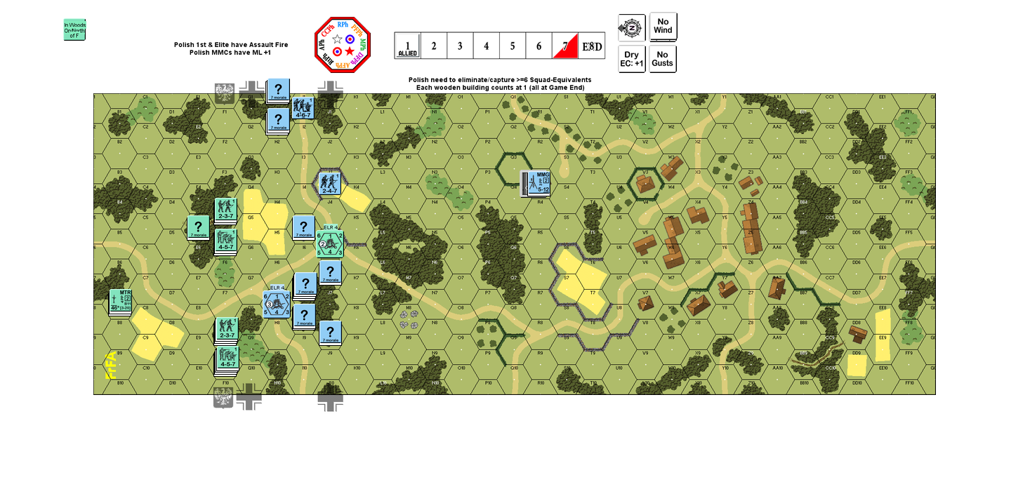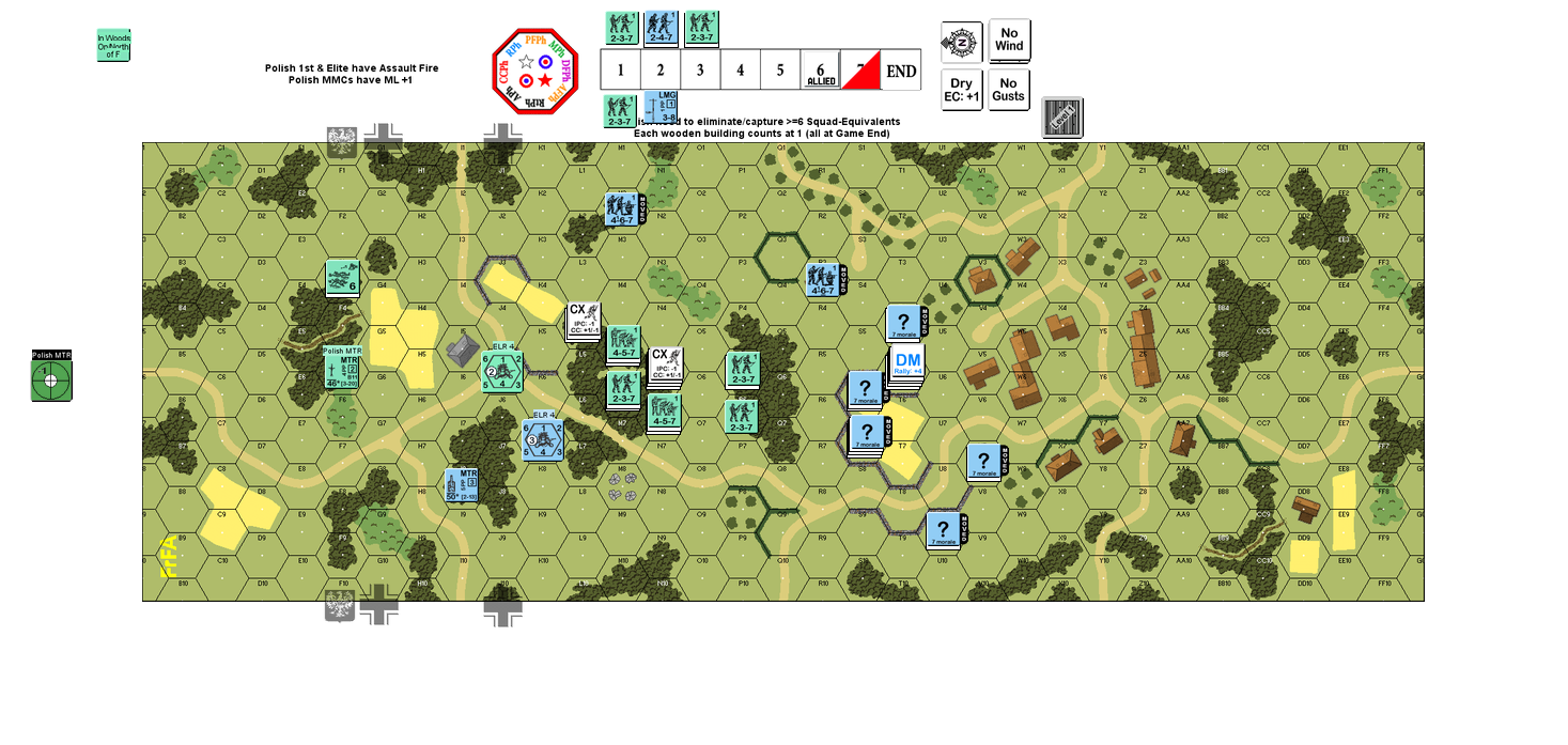 The Polish are set with the task of killing 6 SEq worth of Germans and/or capturing wooden buildings (with one building captured being the equivalent of one squad) in 6.5 Turns. It is an infantry-only scenario on board FrF-A. Below, is a screenshot of our final Setup (illustrating the board as well).